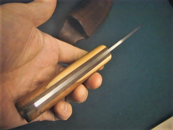 ![]() ![]() Morseth モーゼス by A G Russel (Bob Dozier)サビ跡がいい感じの槌目模様になっています。鋼材:多分炭素鋼 刃長約:10.4cm 全長約:21.8cm 刃厚約:4mm¥29000税込 古いAGラッセルのモーゼスの鋼材は炭素鋼の3枚ラミネートでしたが、このナイフではラミネートのラインが見えません。ブレードのフォルムを見るとほとんど使われず、研がれてもいない様に見えます。 サビ跡があるので炭素鋼だと思います。 小振りで、使いやすい、仕事をこなしてくれるいいナイフです。お尻のスタッグがいい雰囲気を出しています。 受託販売品 Sold 1991年ボブ・ドージャのカスタム製作ナイフ しゃれたいい革シースです。 ![]() ![]() |