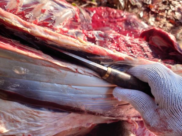 | 2025/12 北海道のフルタイムハンターLone Predator (プレデターみたいに単独で鹿・ヒグマ狩り(駆除?)をしている人-tencho勝手にネーミング) から ZoranさんのPuukkoの評価をいただきました: 今朝, ガタイの良いオンタ(牡鹿)が獲れたので、早速ゾラン使いました。シルキーな感触で厚い毛皮や腱もスイスイ切れる!肉は切れすぎて余計なカットを入れないようにと慎重になってしまう程に切れる。 幅狭ブレードにより複雑な股関節周りもバッチリ。大オンタの背ロース取りには4インチ以上はブレード長がないと苦労しますが、突起のないヒルトのおかげで不都合を感じませんでした。 本当の驚きは夕方に獲った大オンタ2頭目に着手した際、切れ味が最初と全く同じだった事。MM…しゅごい。。しゅごすぎる! 今まで体験した事のない種類の切れ味でした!厚刃なのにシルキー…シルキーなのに切れが止まらない。これからもゾランロンカから目が離せません!そして、研ぎの世界のなんと奥深きことか。 チョイル一つ取っても、ゾランは研ぎの人だと感じます。弟子入りしたいくらいだ… Zoranを 特大オンタのみに使ってみたところ、3頭が限界でした。2頭の時点で見た目は刃先が全て潰れて光の反射を目視できるのですが、なぜか切れました。 特大オンタ3頭といったら、メンタや未成獣を10頭バラすのに近い負担がナイフにかかります。毛皮の厚さや毛皮にかじり込んだ砂の量、腱の丈夫さが中途半端なサイズのオンタとは別モノです。角も本州ジカには見られないサイズを持っており、一つの群れのボスを張るクラスが特大です。 tencho: あまりにも毎日沢山獲物を取るので、そんなに獲れるの? と聞いてしまいました... 私の話は一般のハンターに話してもそんなに獲れるか!ホラ吹くでねぇ!と思われます。そして地元の○○○準拠の先輩方や親方に話せば、別に普通じゃない?話す程の事でねぇぞ。と一蹴されてしまう... |