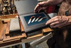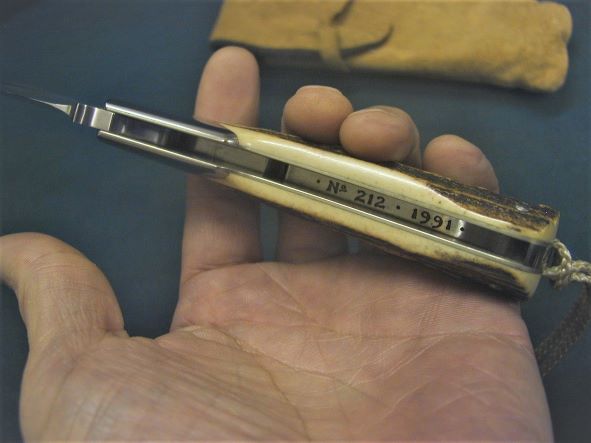 | Ed Louchard 作品 アメリカへ売れてしまった... このスタイルのナイフでは一番気に入ったフォルダーだったと思う。-tencho 鍛造(多分 )フォルダーバックロック 鋼材:?多分炭素鋼-錆跡あり ウッドハンドル 刃長約:6.8cm 全長約:15.7cm 刃厚約:3mm Sold なんだこれはいったい。 今、私はすごい物を手に持っている... 手に取ったら直ぐに感じます、この ナイフを作った人はただ者ではないと。 このフォルダーを持っている、この手が喜びを感じているのだ。 いったい Ed Louchard さんって何者? 調べたら、ナイフに関しては記事が1つしか出てこない。ヨットやボートに関しては2-3の記事が出てくる人でした。 どうやらこの人はマルチタレンテッド 職人らしい。 鍛造でなんでも作ってしまうようだ。鍛造でプーリーとかボート関連品を作っているようだ。勿論ボートやヨットもデザインして造る様子。 そして日本のナイフショウ、多分JKGだと思う(1991年)、に出展している。 「繊細な日本人は私のナイフを気に入ってくれるようだ」 的なことを言っている。 また、「日本のナイフ作家は微妙なラインの変化で大きな表現を成し遂げる」、的な意味の評価をしている。 Arizona C.K. に一本載っていた。スリップジョイントで$250で売れている。またAGRusselでは、スリップジョイントで$895 になっている。 そして、あるフォーラムでは、Ed Louchard を知っている人はいませんか、というスレッドがあったが、ひとつも返答無し。 どうやら無名の巨匠のようだ... 結論by tencho 声: tencho だけだよ、知らなかったのは、lol ... 2022/10/27 Louchardさんのことを知りたくて、日本のある巨匠に聞いたら、あっさり、「知ってますよ...」 「日本に来ているし、ナイフマガジンにも出ていた気がする... 」 「この人はいいナイフを作りますよ。私は1本最高のモノを持ってます。$3500したかな。」 「ハンサムで教養があって、とてもいい人でしたよ。」 「ボートを作っていると言ってました。頭のいい人だと思います。」 「この人のナイフは間違いなくいいナイフですよ。私も買いましたし... 」 鋼材は、D2 鋼を使っていると教えてくださいました。 2023/4/12 ナイフ業界で有名なハンター、ナイフコレクター/ユーザーでドクターの方から 大昔 1982~84ごろ?の、皆さまもご存知の有名老舗刃物店さんの「カスタムナイフ在庫リスト」カタログをいただきました。 リストの一番下に: 「 ローチャード 、フォールディングナイフ、154CM、象牙ハンドル、2-3/4”¥163000」の記述がありました。 小さいフォルダーが、40年前で163000円の値段が付いていたんです... ![]() ![]() ![]() ![]() この背の↓↓横方向の丸みに癒しを感じたのかなぁ。↓ とにかく、手に持って気持ちいい。 ジェス・ホーンにも Ron Lake にもない、不思議なホッとするような気持ちよさ。 ランヤードループの造りが洒落ています ↓↓ アクション、作りは精密です。 残念ながら 錆跡あり ↑↑ 税込 |