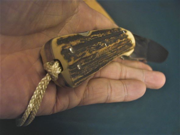 | Ed Louchard 作品 (多分)鍛造フォルダーバックロック 鋼材:?多分炭素鋼 極上スタッグ 刃長約:8.2cm 全長約:19.6cm 刃厚約:4.5mm Sold ブレードバックからハンドルの背もアーチの丸みを帯びて、見てて、触って気持ちいい。ボルスターも同じ。フラットではない。 売れてしまった...これもアメリカへ渡ってしまった。 本当に素晴しい。 この値段は半額のようなもんだ。 税込¥220,000 |