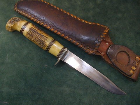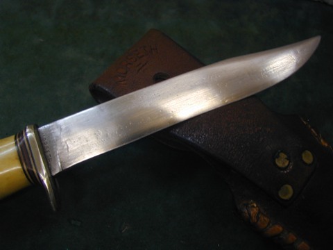 | Morseth モーゼス 1960年ごろの製作 刃長約14cm 全長約26cm 3 ピーススタッグ、オリジナルシース ラミネートの筋が見えます。↑↑ A.G.Russel のモーゼスではありません。 ハリーかスティーブ・モーゼスが作ったものです。 さび取り磨き跡あり。 ↓↓ ベルトループ部分に ” MORSETH 三 ” |