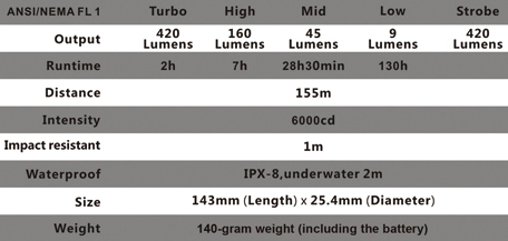 LED:米国Cree社製 XP−G R5 ・2つのスイッチで簡単操作 ・225ルーメン(2時間45分)−4ルーメン(480時間)−49ルーメン(63時間)−120ルーメン(100時間) |