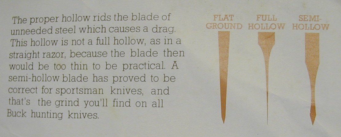 ↑AL BUCK の古い解説カタログから... よくわからない説明ですが、 「BUCKのハンティングナイフは全てSemiーHollow の削りになっています。 Semi-Hollow は実用的で いいのだ」 と言っています。 切り込んだとき、抵抗が一番少ない、とも言っています。 古い110のエッジは、よ〜く見るとハマグリ刃になっていますね。 |