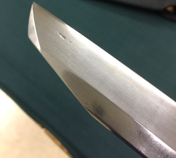 | 田辺一寿 日本刀残欠ナイフ 鋼材: 刃長約:12.5cm 全長約:23.5cm 刃厚約:4.8mm¥17000税込 Sold |