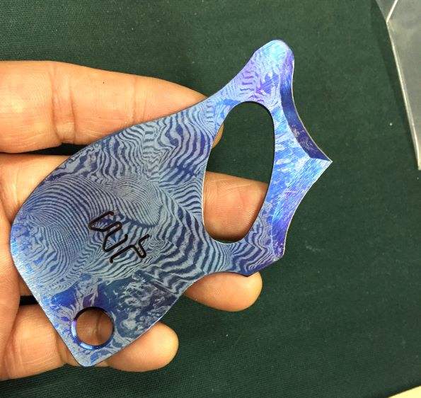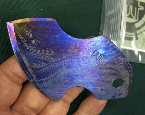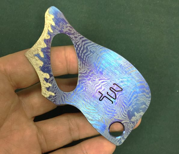 | ウオーレントーマスではありません。 Not Warren Thomas チタン カオスクロー Ti Chaos Claw チタン ¥13000税込 全長約15.9cm 刃厚約:3mm A. H. のチタンクローと比べて こっちの鼻(ブレード)がしゅ〜っと伸びて、ちょっと長い。 刃厚は3mmで少し薄い。 鋭く切れる刃は付いておりません。 構造上刃がかなり鈍角になり、おまけにチタンなので切れる刃は期待できません。 ↑一番下腐食仕上げ 表、 ↓腐食仕上げ 裏 腐食仕上げは無くなりました。 写真左: シルバー系 (一番上は腐食仕上げ) 写真右:パープル系 全長約15.9cm 刃厚約:3mm 在庫: シルバー系2本、 パープル系:1本 |