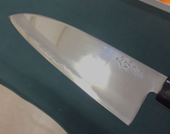 西田刃物工房 大祐作 白一号本割込 三徳包丁 鋼材:白紙1号 刃長約:18cm 全長約:32.5cm 刃厚約:2.5mm 買取品 未使用な美品 税込¥6000 |